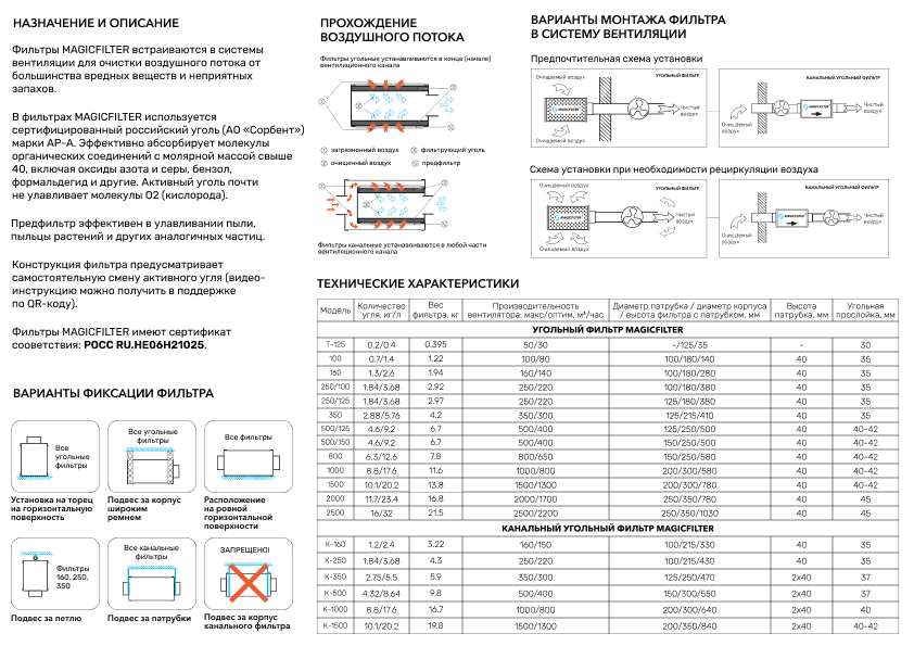 В фильтрах MAGICFILTER уголь утрамбован на вибростенде, материал фильтра не пропускает угольную пыль и вентиляция остаётся чистой. Воздух максимально очищает проходя через толстый слой угля по всей длине фильтра. Для максимально эффективной фильтрации рекомендуем использовать канальный вентилятор меньшей производителься чем фильтр.